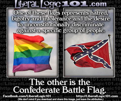 Not all Conservatives willingly play the victim card. Just the most extreme radicals who read this bullshit and believe it , and Liberal Logic 101 willingly caters to the most radical , bigoted , and racist individuals on the right. But there are plenty of Conservatives who know what these two flags represent. They know that the rainbow flag represents diversity among a group of individuals with diverse religious and political views , and the confederate flag represents centuries of slavery , Jim Crow , and racism. Anyone who claims otherwise , is ignorant of American history.
