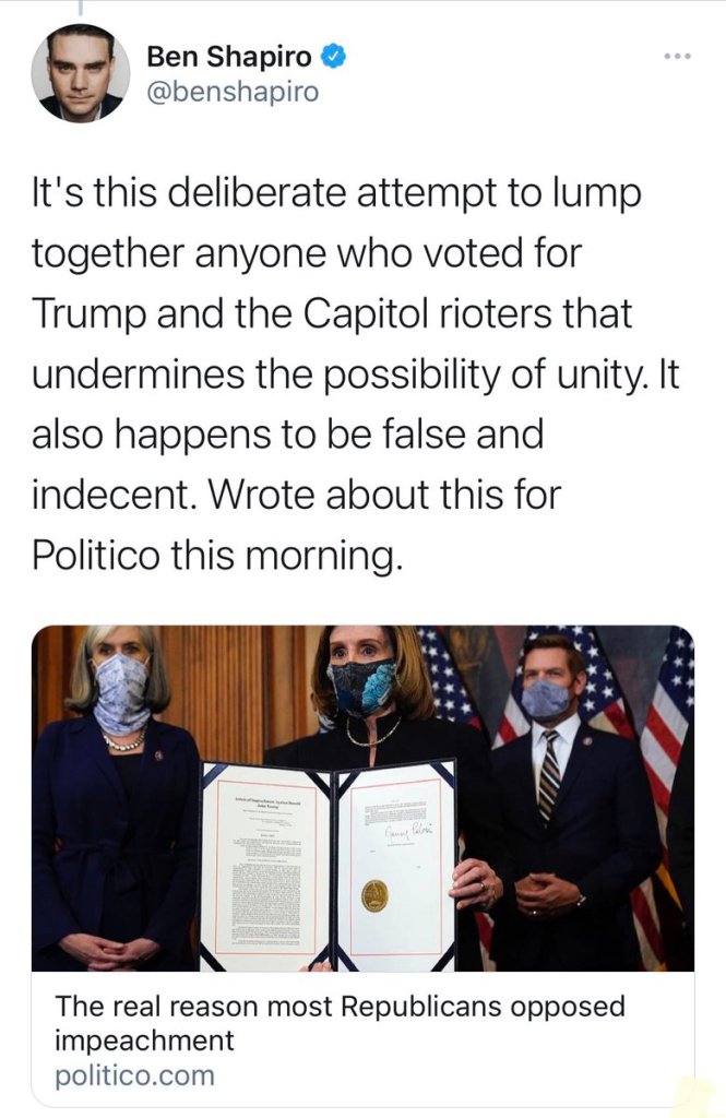 Ben Shapiro is full of s**t. Conservatives had their chance at unity by accepting the results of the election, but instead chose to lie and invent conspiracies of a “stolen election,” that led to an assault on the Capitol. F**k their calls for unity. And f**k Ben Shapiro.