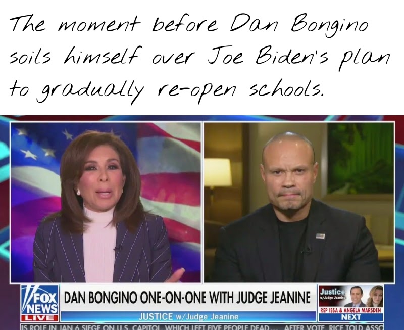 https://www.mediaite.com/tv/dan-bongino-says-biden-administration-are-cowards-over-not-immediately-sending-kids-back-to-school/ During a live broadcast of Justice With Judge Jeanine, Dan Bongino accidently crapped himself while discussing president Biden's plan to gradually and safely re-open schools, calling them "cowards" who are "full of s***." "Let me ask you this, Dan," Pirro asked. "Why is the Joe Biden administration going along with the teachers not going …