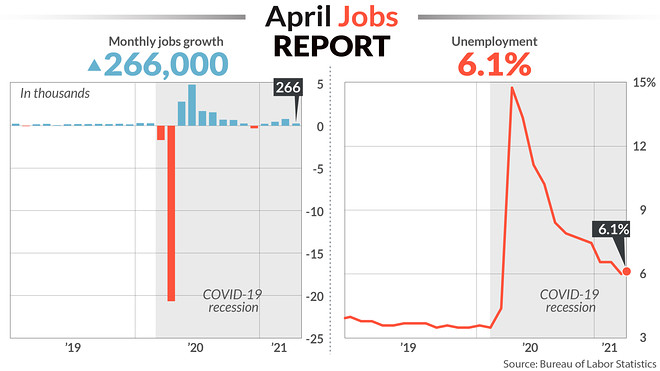 According to the Labor Department 266,000 jobs were added to the economy in the month of April, way less than the number expected by economic experts. Estimates from Dow Jones had been as high as one million with an unemployment rate at 5.8%. The Labor Department previously reported that 916,000 jobs had been added, but …